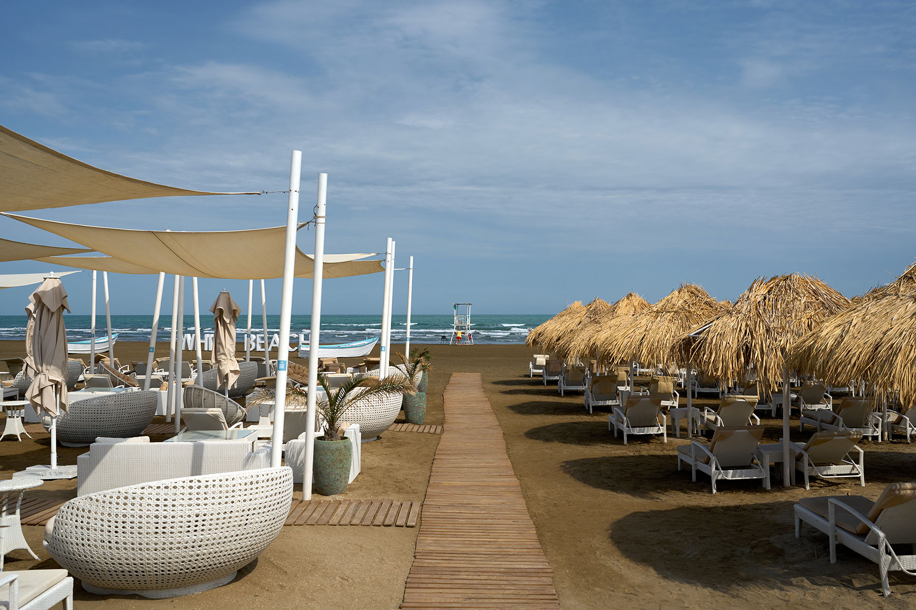 White Beach Club объединяет в себе ресторан-террасу и обширную пляжную зону возле банкетной площадки Event Hall. Дизайн отсылает к пляжным клубам и традиционной архитектуре Миконоса с его лаконичными белыми домиками. Территория оборудована шезлонгами с зонтиками, шатрами и газебо, гарантирующих защиту от солнца. Элементы озеленения гармонично вписываются в белоснежную концепцию, а продуманная подсветка в вечернее время превращает пляж в настоящее клубное пространство.