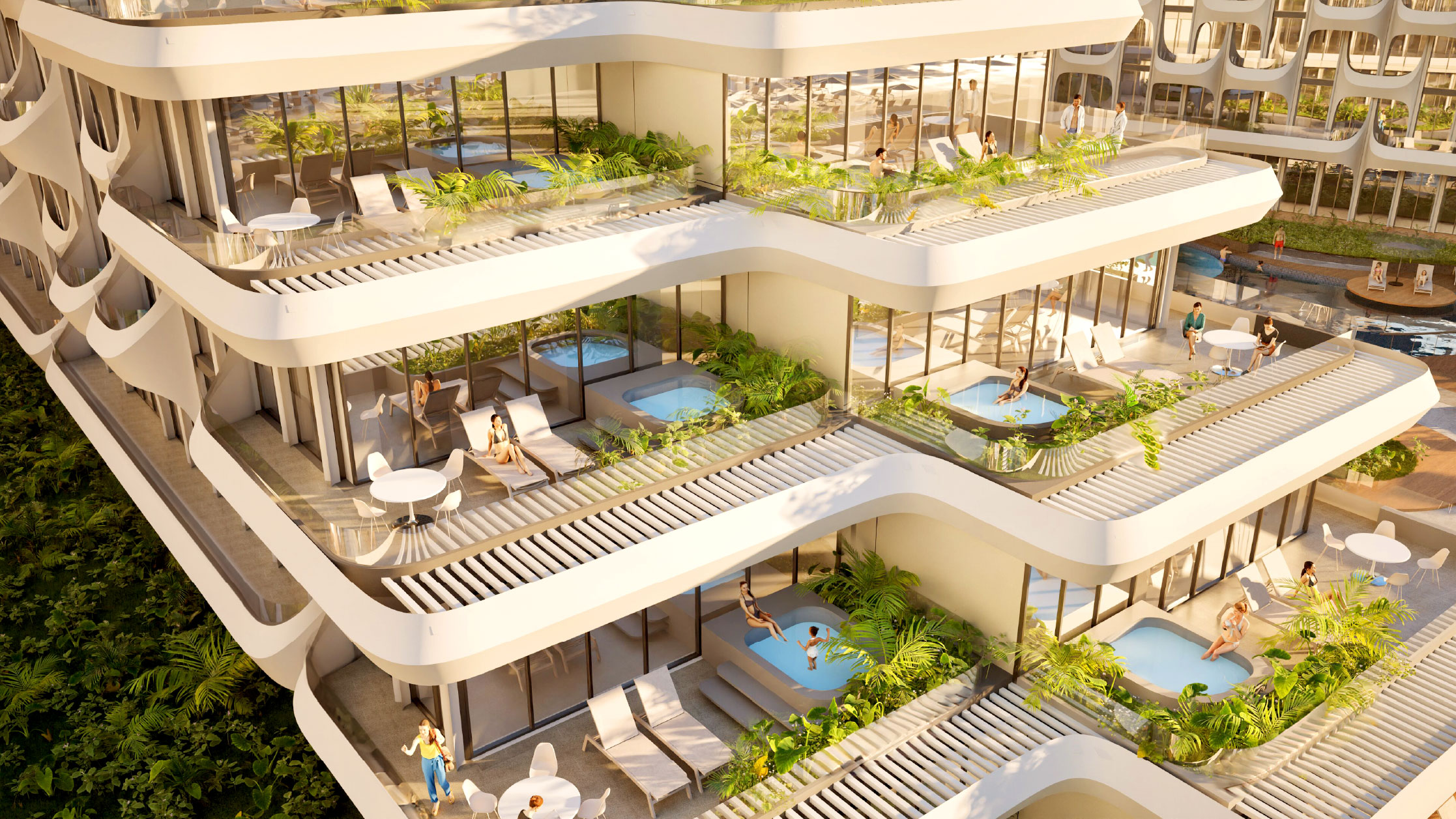 В угловых резиденциях предусмотрены открытые джакузи на просторных террасах, где вы можете наслаждаться морским бризом и завораживающими закатами прямо из собственного дома.